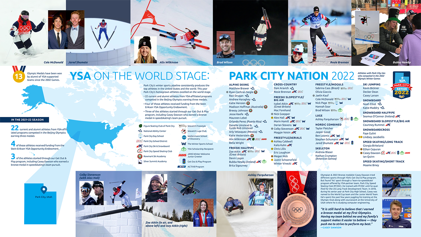 Youth Sports Alliance annual report: 5 x 7" accordion-fold brochure that opens to a poster featuring local athletes who participated in the 2022 Winter Olympic Games